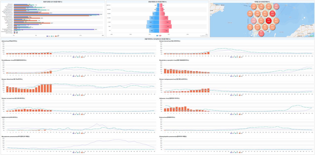 본 대시보드는 최근 3년간 수행한 PCR 검사 데이터를 기반으로, 호흡기감염증 12종(급성 호흡기바이러스 10종, 세균 2종)과 장관감염증 5종의 주별 양성률과 유행곡선을 제공합니다.