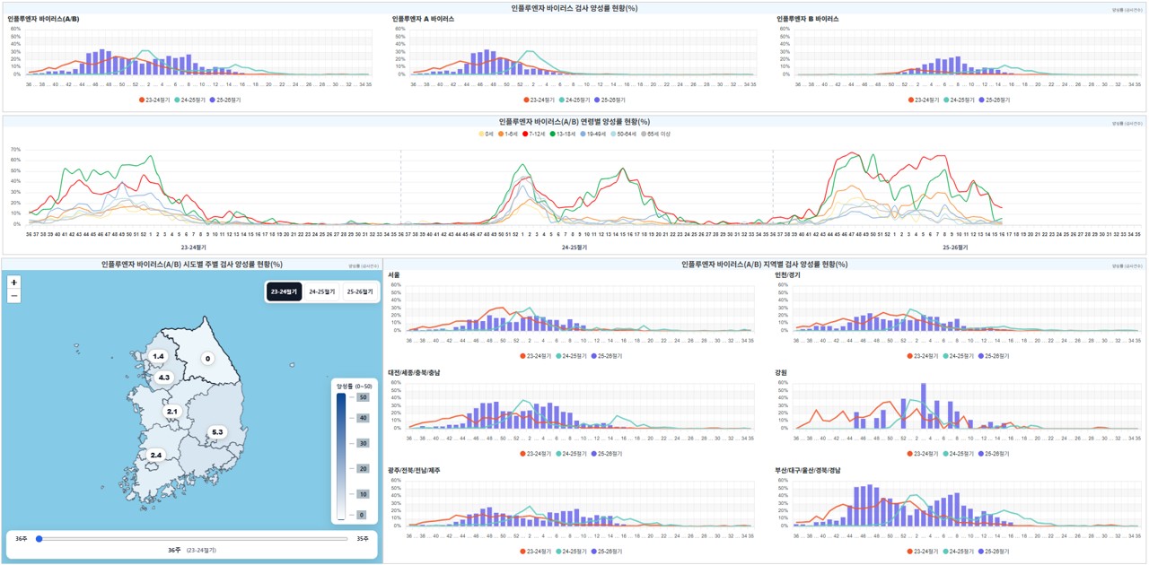 또한 최근 3개년의 검사 양성률을 시각적으로 비교할 수 있도록 구성되어 있어, 올해의 유행 양상을 파악하고 예측하는 데 도움을 줍니다.