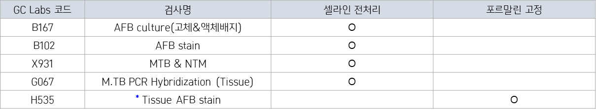 * Tissue AFB stain : 단독의뢰 시 염색만 시행, 조직병리검사와 동시의뢰시 결과판정
