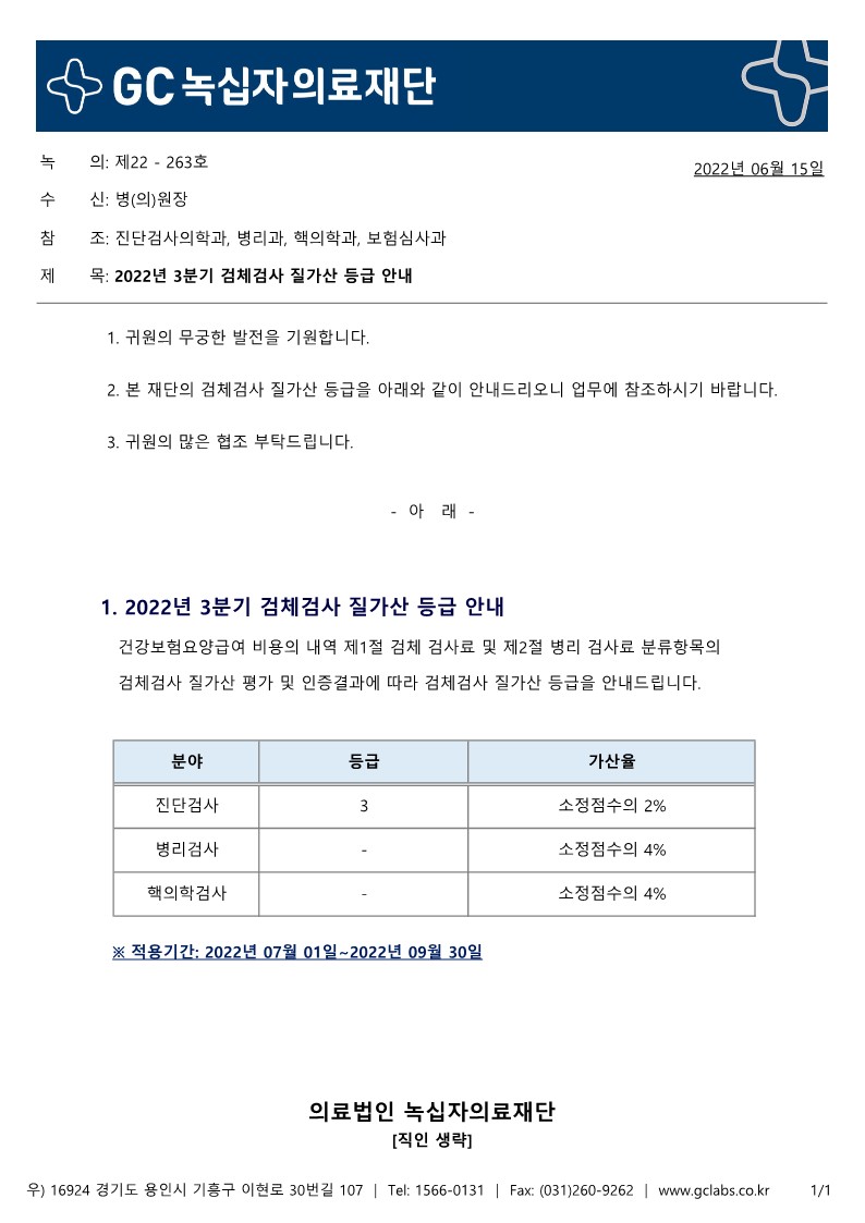 녹의 제22-263호(2022년 3분기 검체검사 질가산 등급 안내)본 재단의 검체검사 질가산 등급을 다음과 같이 안내드리오니 업무에 참조하시기 바랍니다.1. 2022년 3분기 검체검사 질가산 등급 안내