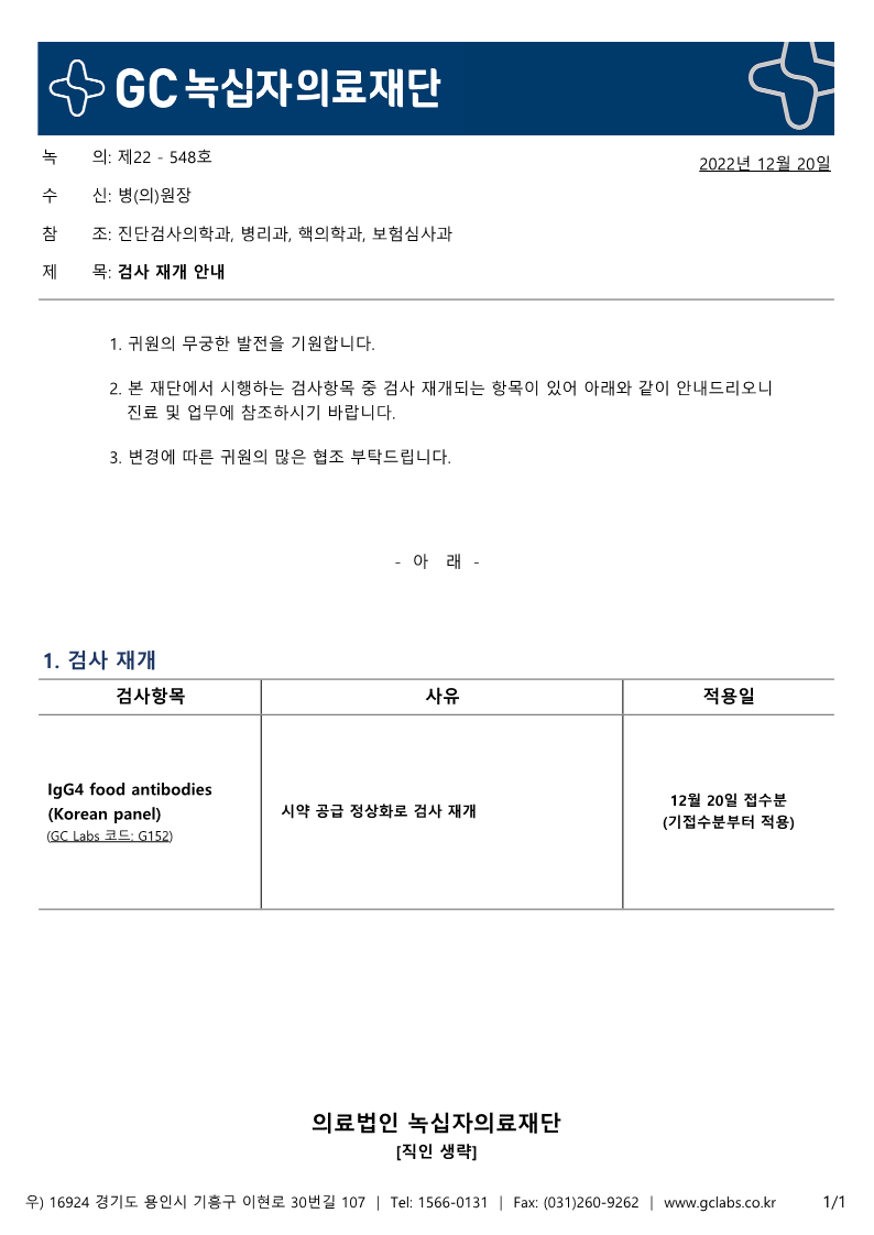 본 재단 검사항목 중 일부 항목의 변경사항이 있어 아래와 같이 안내드리오니 진료 및 업무에 참조하시기 바랍니다.