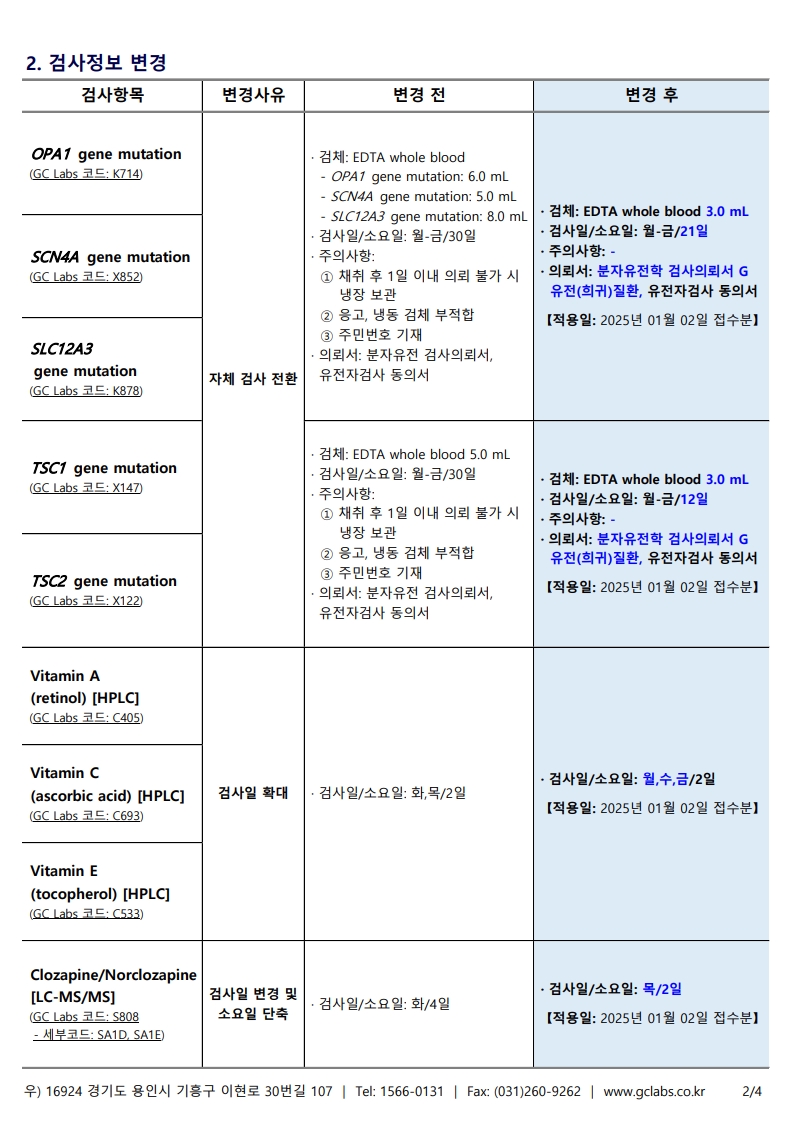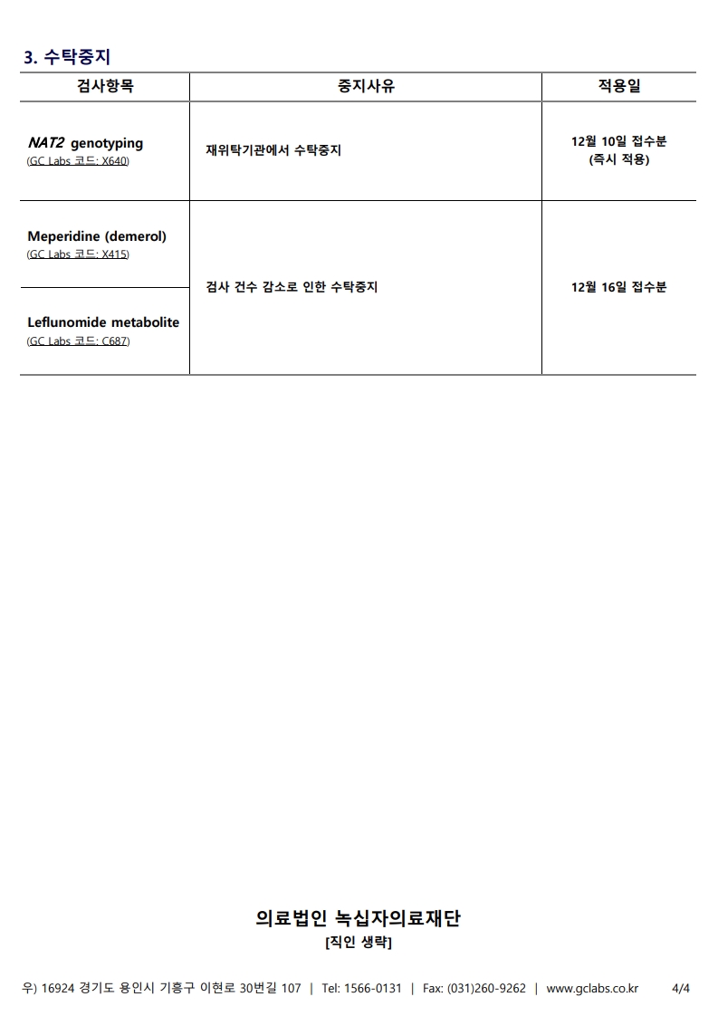 본 재단에서 시행하는 검사항목 중 일부 항목의 변경사항이 있어 다음과 같이 안내드리오니 진료 및 업무에 참조하시기 바랍니다.