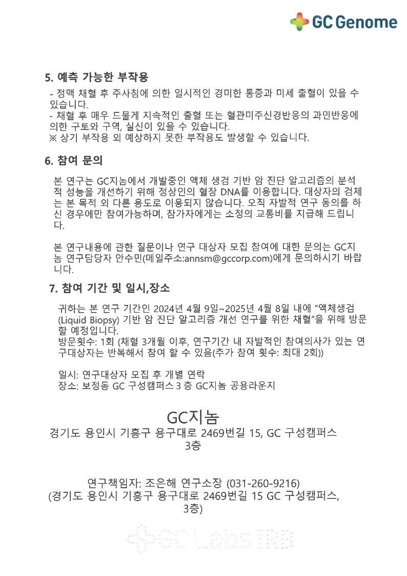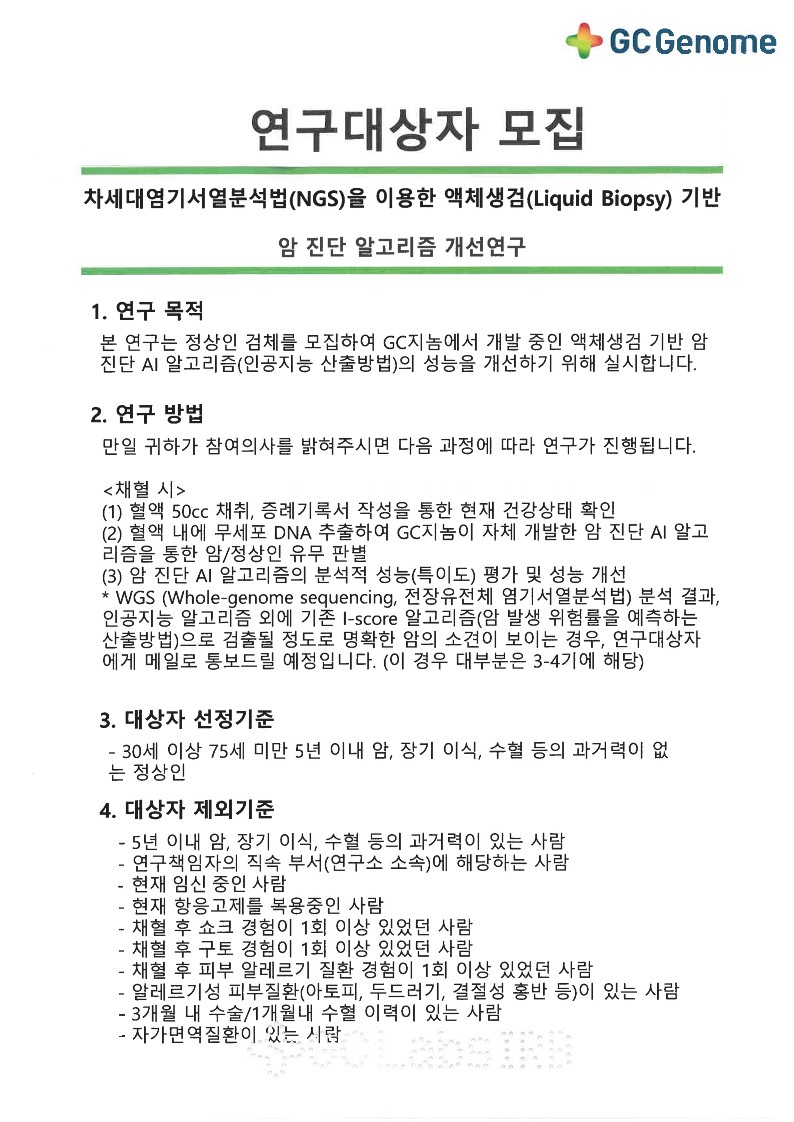 [모집종료] 차세대염기서열분석법(NGS)을 이용한 액체생검(Liquid Biopsy) 기반 암 진단 알고리즘 개선 연구
