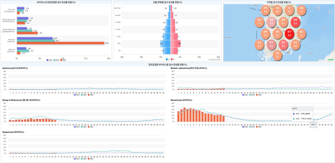 또한 최근 3개년의 검사 양성률을 시각적으로 비교할 수 있도록 구성되어 있어, 올해의 유행 양상을 파악하고 예측하는 데 도움을 줍니다.