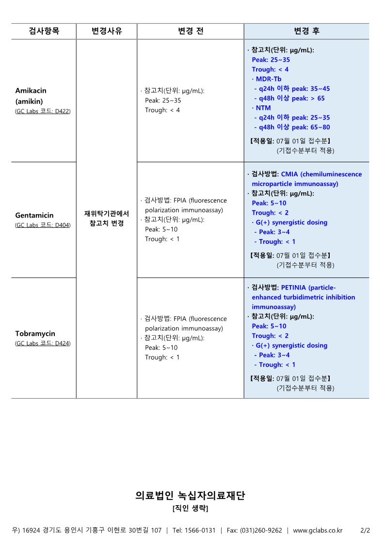 본 재단 검사항목 중 일부 항목의 변경사항이 있어 아래와 같이 안내드리오니 진료 및 업무에 참조하시기 바랍니다.