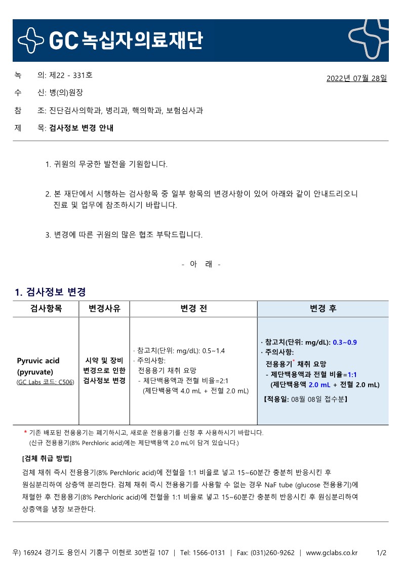 본 재단 검사항목 중 일부 항목의 변경사항이 있어 아래와 같이 안내드리오니 진료 및 업무에 참조하시기 바랍니다.