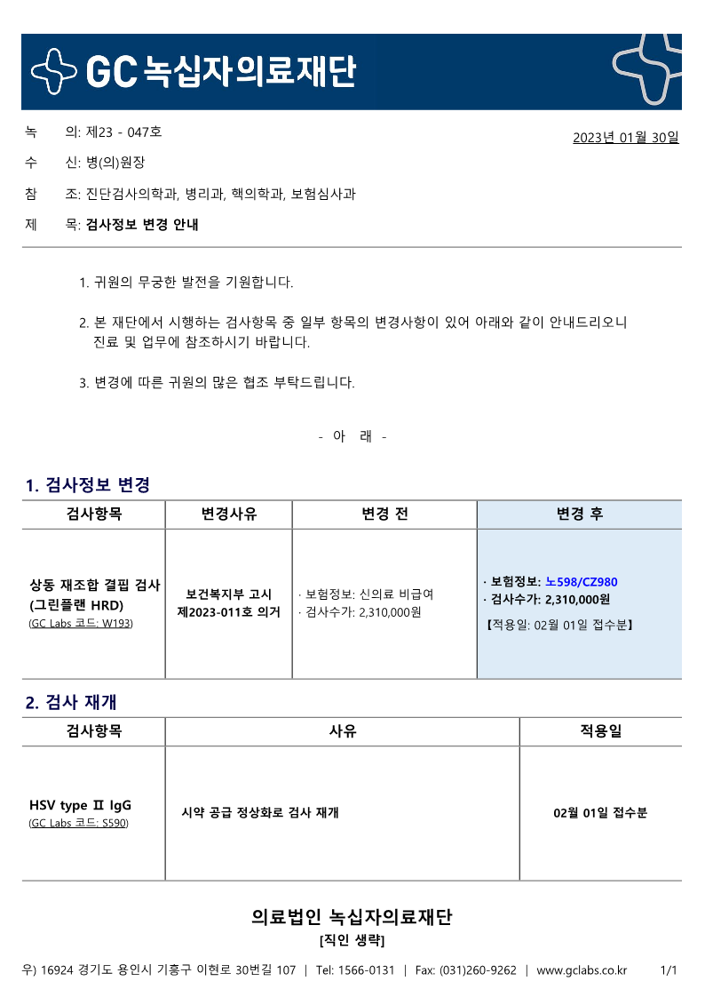 본 재단 검사항목 중 일부 항목의 변경사항이 있어 아래와 같이 안내드리오니 진료 및 업무에 참조하시기 바랍니다.