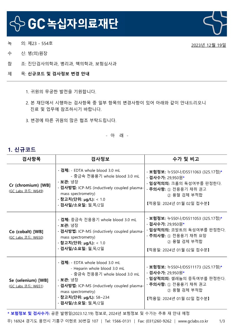 녹의 제23-554호(신규코드 및 검사정보 변경 안내)