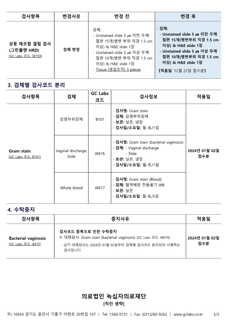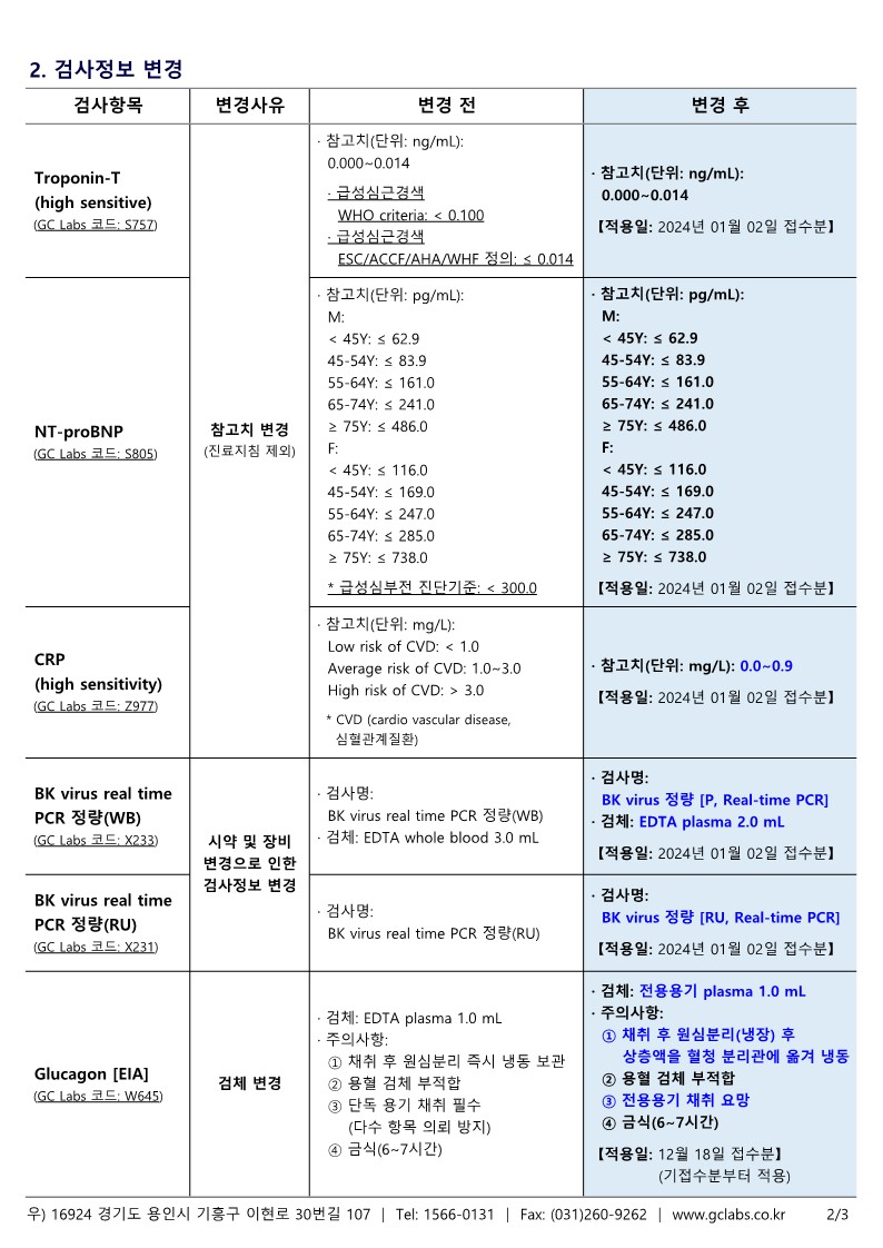 본 재단에서 시행하는 검사항목 중 일부 항목의 변경사항이 있어 아래와 같이 안내드리오니 진료 및 업무에 참조하시기 바랍니다.